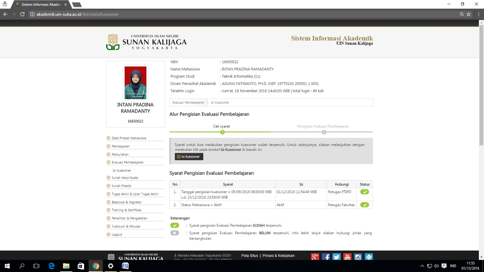 Apabila mahaiswa lalai dalam melakukan Pengisian Kuisioner ini dapat mengakibatkan yang bersangkutan tidak dapat melihat nilai (KHS) semester Gasal 2016/2017 pada saat herrigistrasi(pengisian KRS) semester Genap2016/2017.