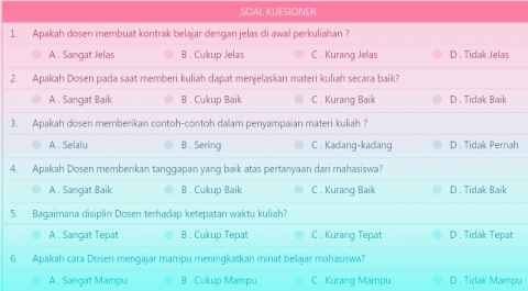 Silahkan login dan memilih menu "Evaluasi Pembelajaran" sub menu "Isi Kuesioner" untuk memulai mengisi,lengkapi semua ....