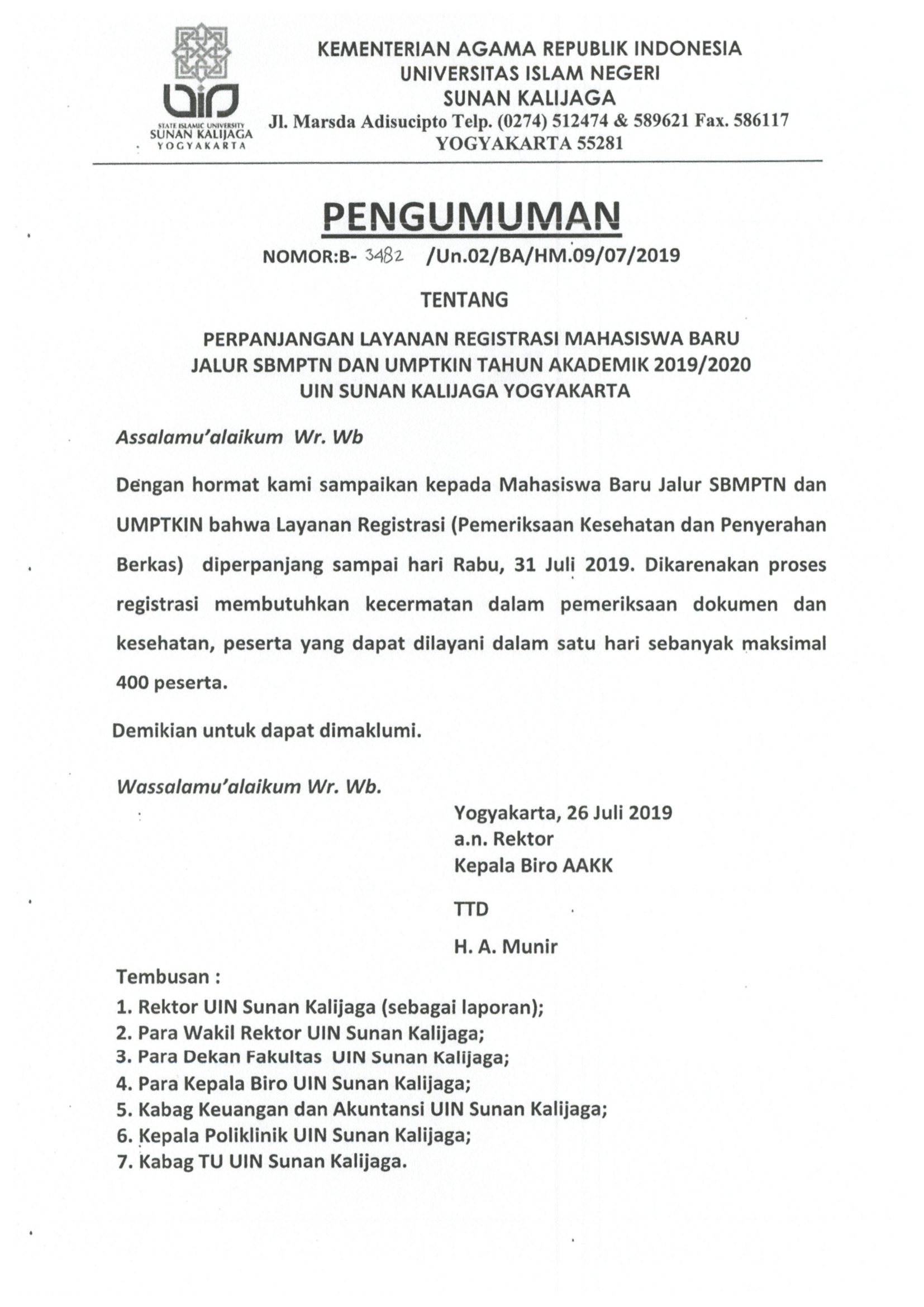 Perpanjangan Layanan Registrasi Mahasiswa Baru Jalur SBMPTN dan UMPTIKIN T.A 2019-2020 ...